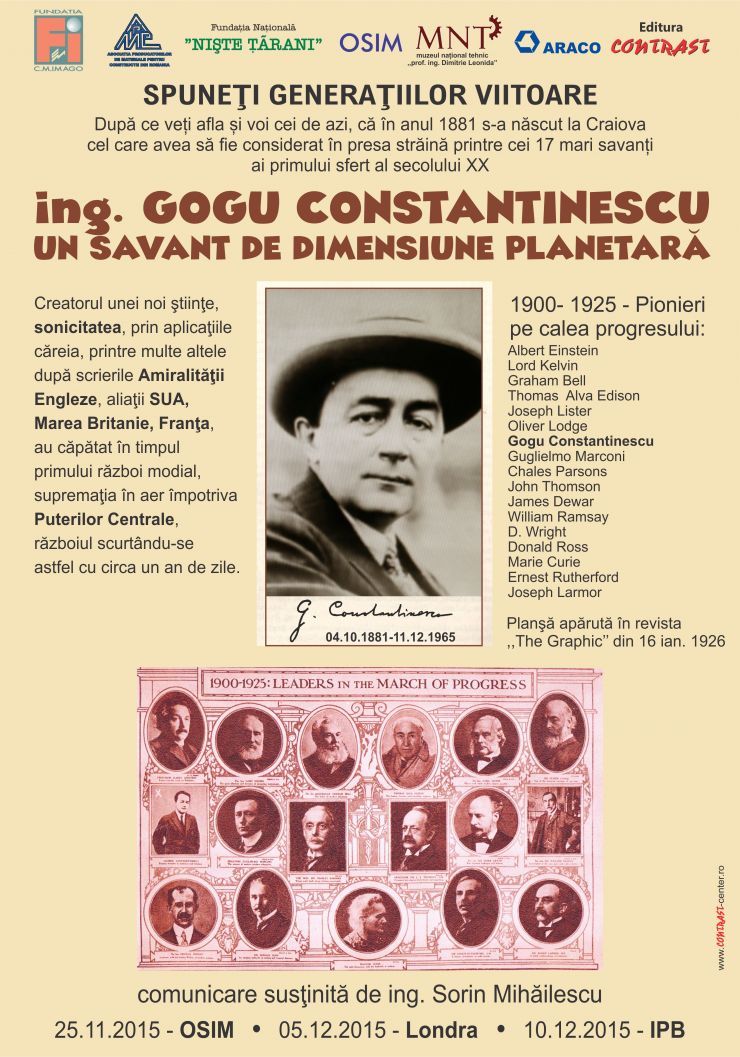 Genialul Gogu Constantinescu, savantul care a cucerit Londra prin invențiile sale, a fost omagiat la Londra, la mică distanță de Hala „Sonic works”, unde au fost experimentate cu succes crecetările bazate pe teoria sonicității, descoperită in anul 1918.